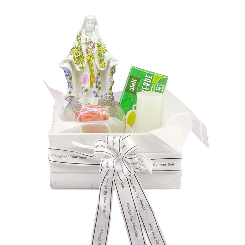 Hermoso Kit compuesto por un boton de rosa preservada en bombonera, Caja de aromáticas, Velón y virgen pintada a mano.