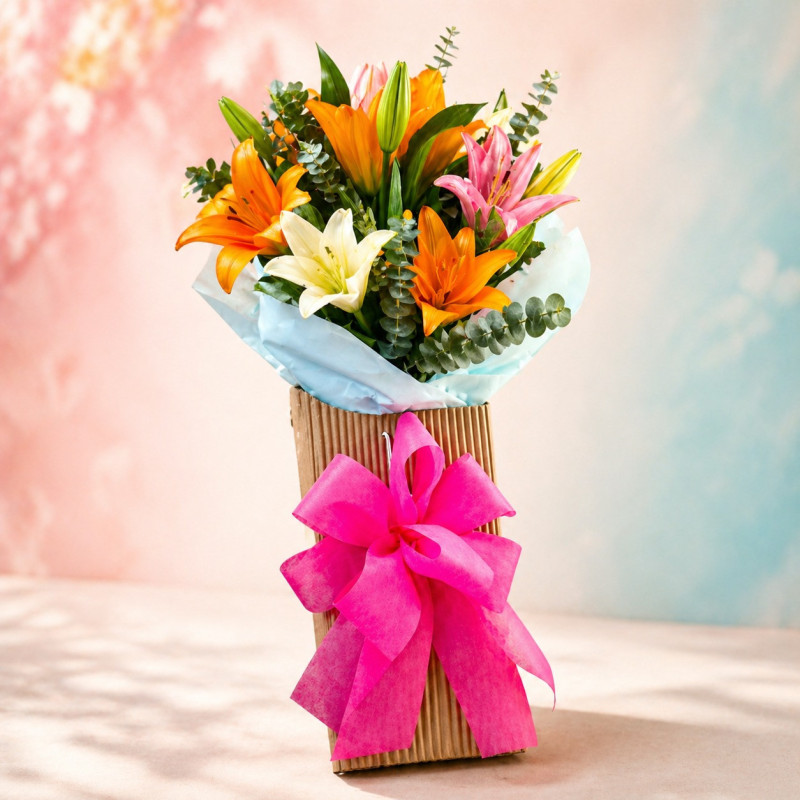 Demuestra todo tu amor y gratitud en el Día de la Madre con este delicado arreglo de lirios, elegantemente presentados en una bolsa ecológica de cartón corrugado. Decorado con follaje natural y un delicado moño de cinta, este detalle es el regalo perfecto para hacer sentir especial a la persona más importante en tu vida.