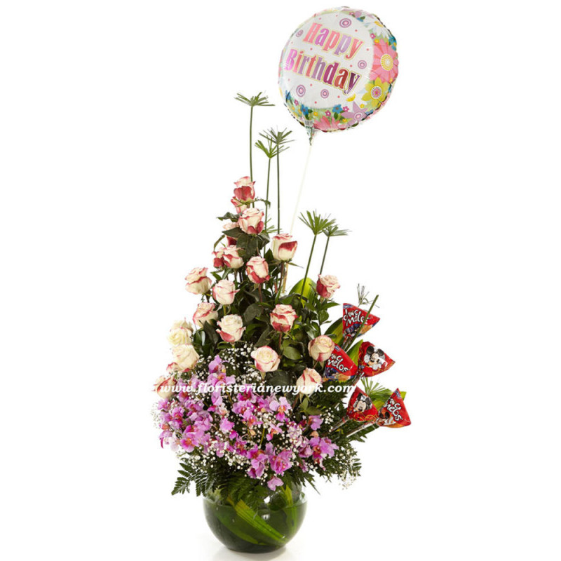 Celebra los 15 años con este espectacular arreglo que combina rosas frescas, orquídeas exóticas y globos temáticos (incluye un globo con el número 15 y uno de princesas). Este diseño elegante y vibrante es perfecto para transmitir alegría y hacer inolvidable un día tan especial.