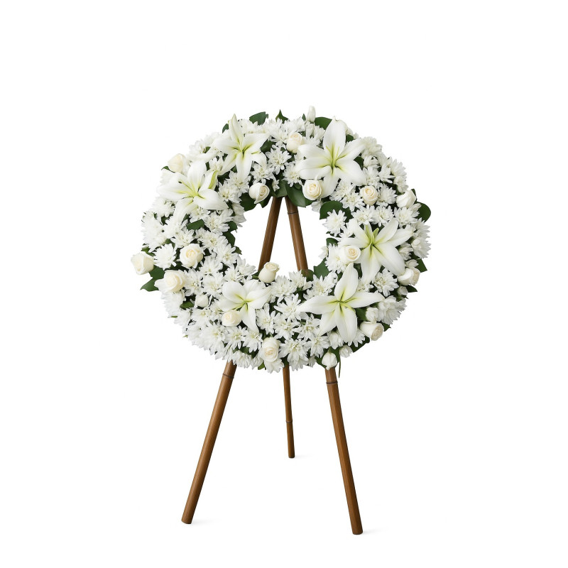 Rinde un homenaje solemne con nuestra corona fúnebre americana, elaborada exclusivamente con flores blancas, símbolo de pureza, paz y amor eterno.