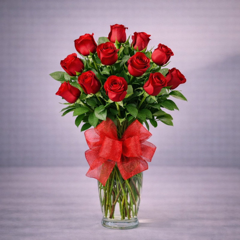 Florero de 12 Rosas al agua acompañado con moño y tarjeta personalizable. Ideal para embellecer espacios en casa y oficina, sorprende con este sutil y lindo detalle de rosas.