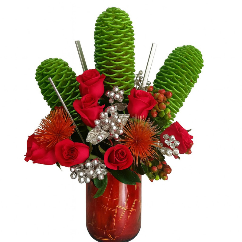 Sorprende con un exclusivo arreglo de 14 rosas rojas, acompañado de 3 maracas pintadas en verde y exóticas pintadas en rojo perfectas para darle un toque de iluminación aal arreglo, terminado con apliques plateados que contrastan los colores navideños en una base de cristal (cilindro) forrado.